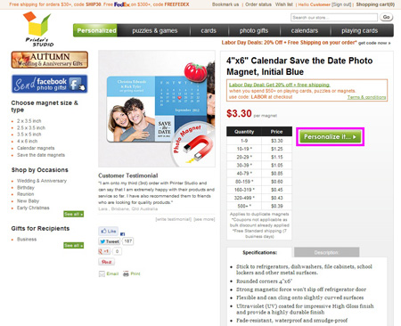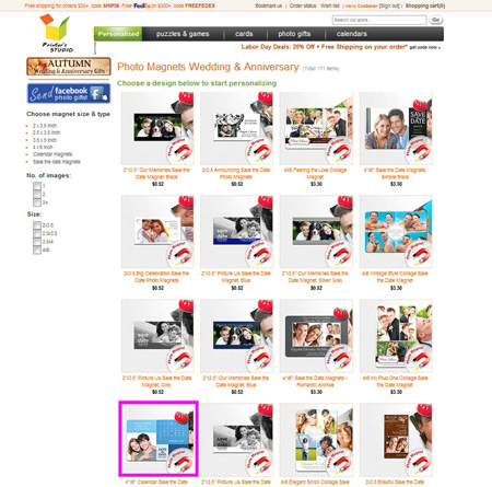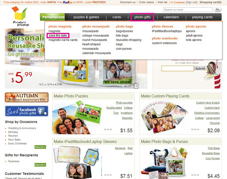 Hover the mouse-cursor over the Photo Gifts tab and click save the date