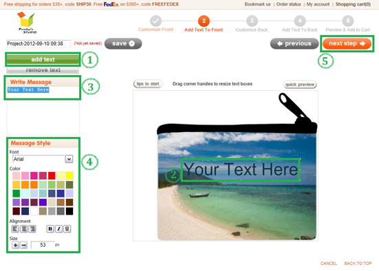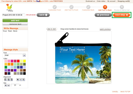 Repeat the steps in STEP 4 above to add text to the template, click on Next Step button at top right when you are ready.