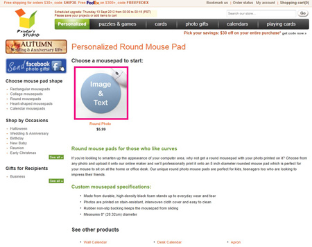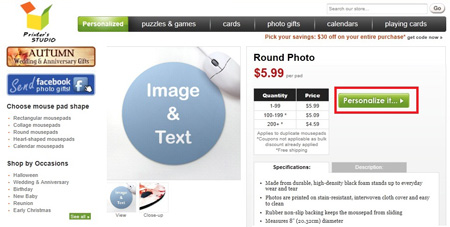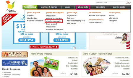 Hover the mouse-cursor over the Photo Gifts tab and click round mousepads
