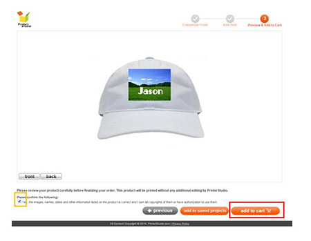 You will see a preview of your personalized item at this step. Click Previous button at the bottom of the page if you need to make any changes to your design.