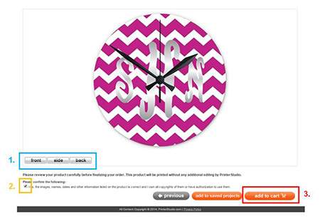 - Preview the front, side and back design of the clock